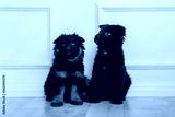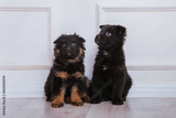 Two black and brown German Shepherd puppies are sitting on a white background. Lovely pets.