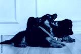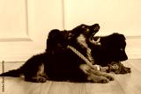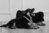 three brown and black german shepherd puppies play with animal toys. Favorite pets.