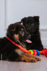 three brown and black german shepherd puppies play with animal toys. Favorite pets.