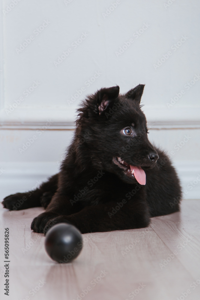 black German Shepherd puppy sits on a white background. Favorite pets.