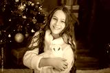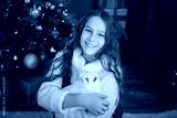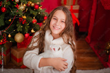 A beautiful long-haired girl holds a white rabbit in her arms. Against the background of the Christmas tree.