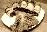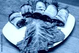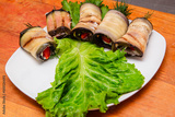 Sliced eggplant roll with herbs and tomatoes on a plate. Holiday appetizer.