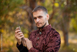 A young man in medieval brown clothes stands with an old book in his hand. A guy in a historical costume in nature.