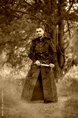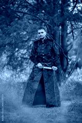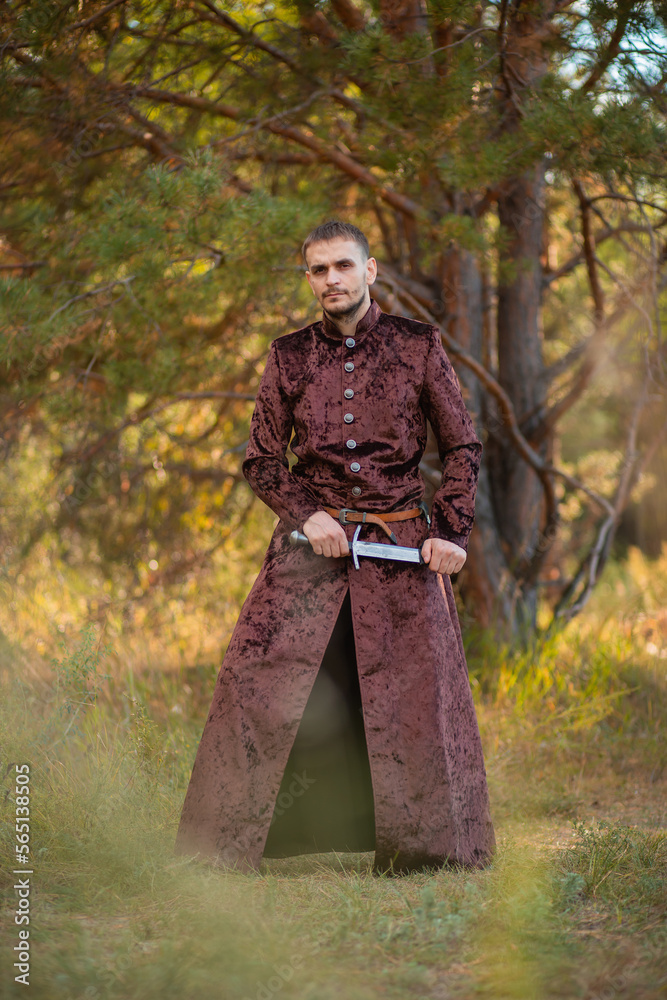 A young man in medieval brown clothes stands in the forest with a dagger. A guy in a historical costume in nature.