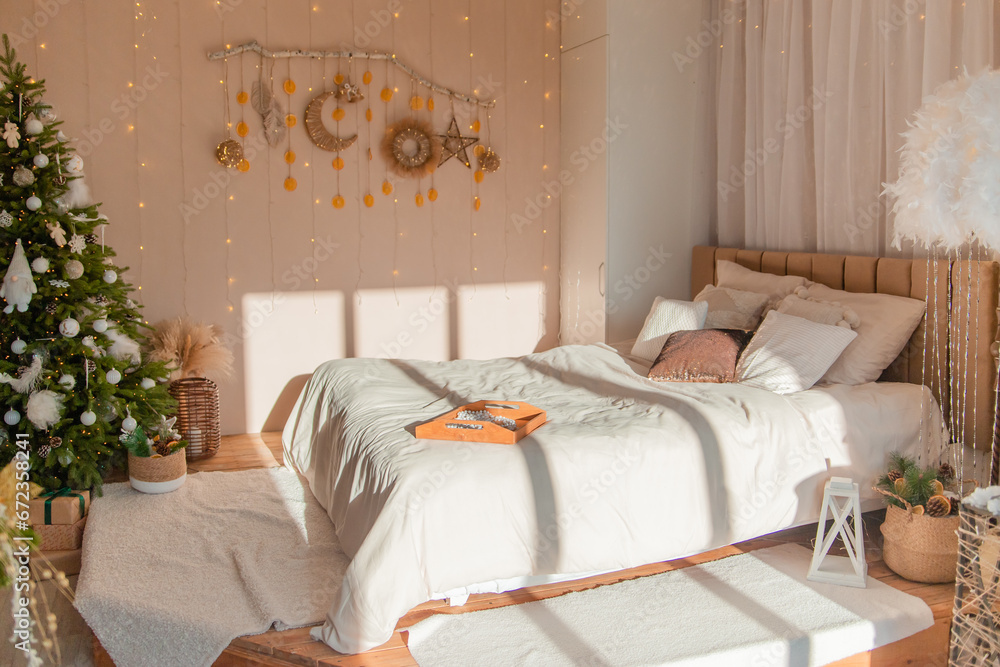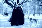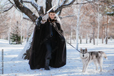 Handsome male warrior with a sword in winter near a snow-covered tree with a wolf. The guy with the husky in the forest in a raincoat.