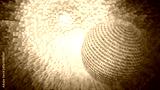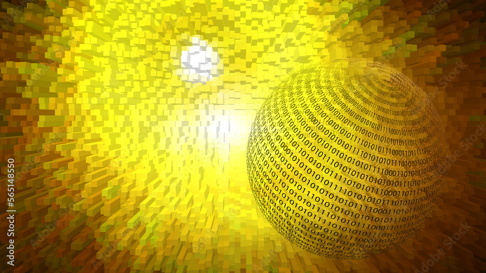 image of a ball with a binary code on the surface against the background of parallelepiped constructions