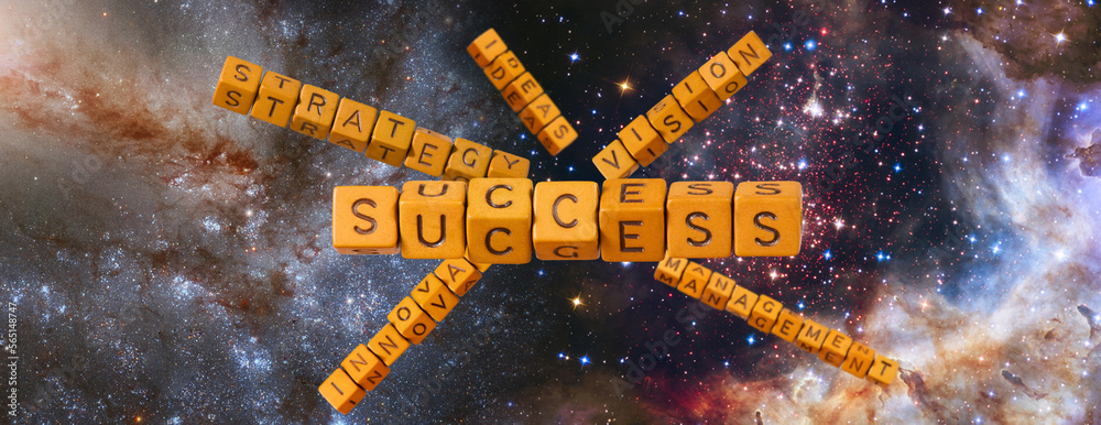 3D-image of cubes with inscriptions success, strategy, vision, innovation, ideas and management against the backdrop of a beautiful starry sky.