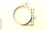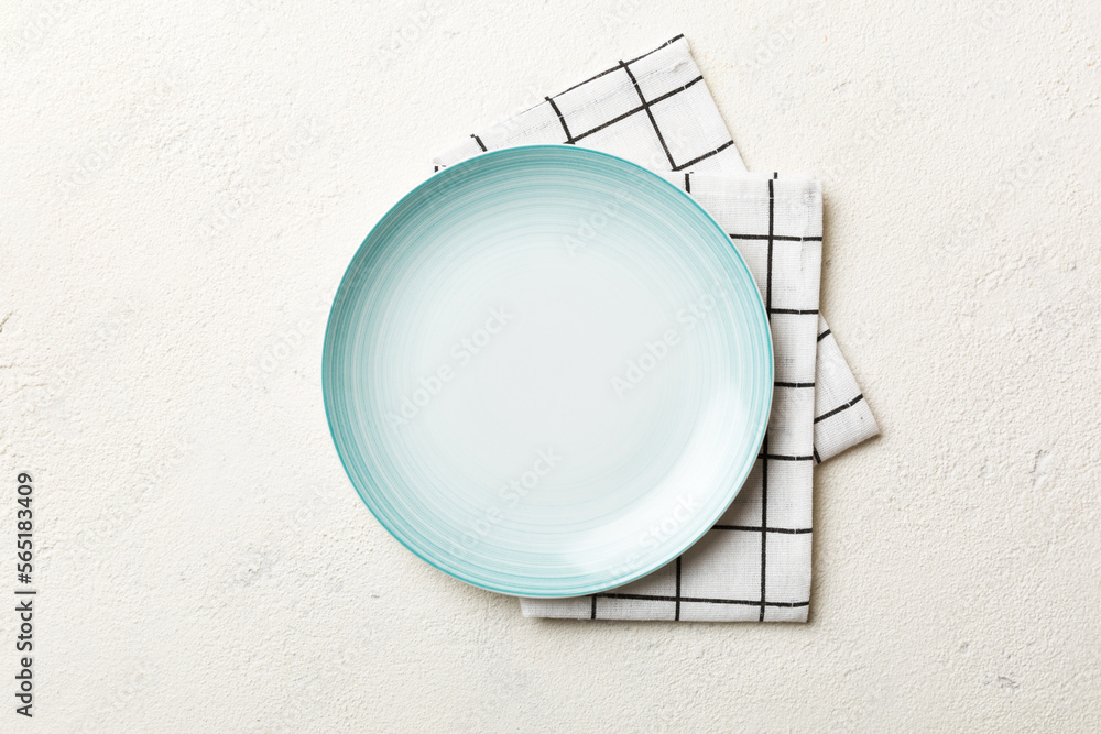 Top view on colored background empty round blue plate on tablecloth for food. Empty dish on napkin with space for your design