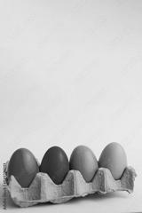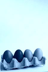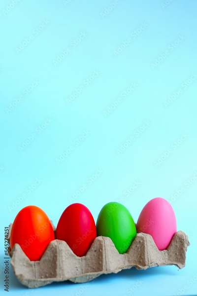 multi-colored Easter eggs, hand-painted by children, lie on a blue background, top and side view