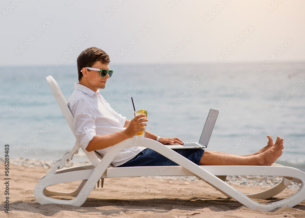Young man in sunglasses and white shirt is lying on a beach chair on the seaside holding a cocktail and a laptop.