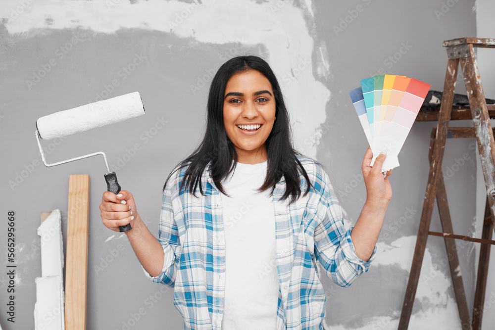 Young Indian woman poses with paint, brush, swatches getting ready to paint wall