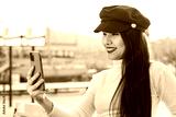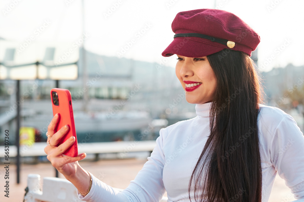 Stylish woman with beret smiling while taking selfies with mobile phone outdoors.
