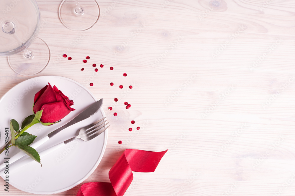 Valentine's day table setting with red rose