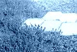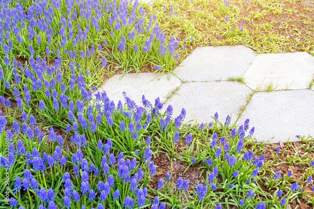 Landscaping. Lawn with flowering hyacinths. Edging of a footpath in a public park