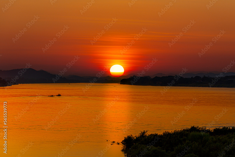 Panoramic view of the Mekong River,Picturesque the Mekong River and Luang Prabang town at dusk, view from Phou si summit, a tranquil scenery of UNESCO World Heritage Site, North Laos. Soft focus.