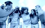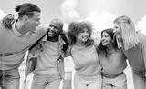 Student, friends and happy people with diversity, happiness and university support. Students community, smile and college group outdoor ready for learning and teamwork with motivation and blue sky