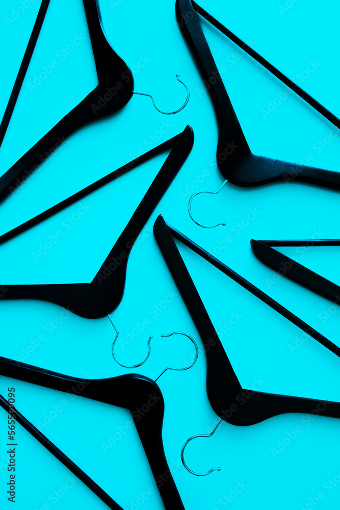 Black wooden clothes hangers on a blue background. Men's fashion and shopping concept.