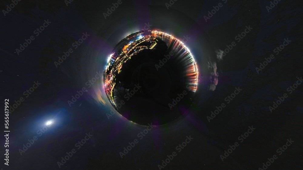 A tiny planet view of the ports of Harwich and Felixstowe at night in the UK