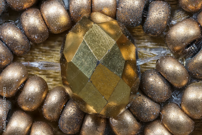 Extreme close up shot of bigger bead surrounded with smaller beads on a ladies bag.