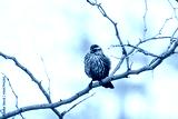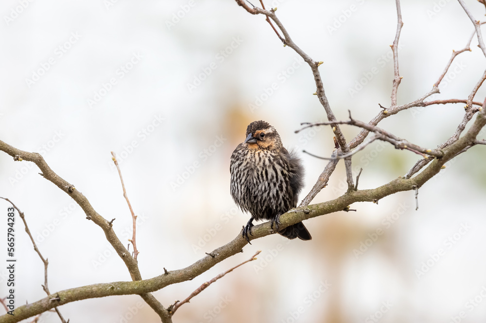 Close up view of juvenile Pine Siskin bird on a tree branch.