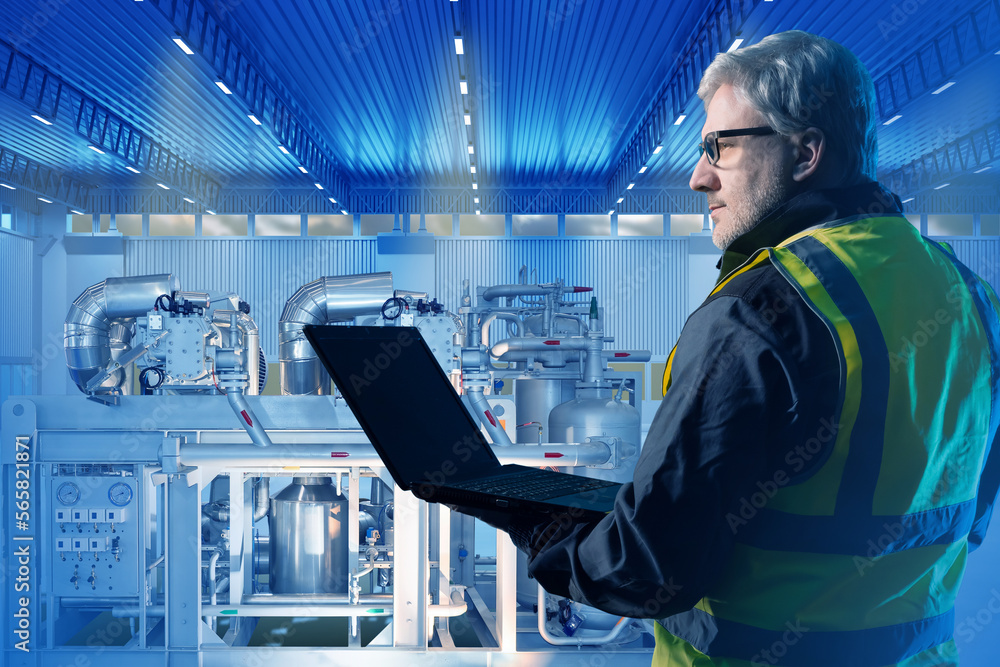 Man engineer works in chemical industry. Guy with laptop stands in factory with chemical equipment. Supervisor controls refinery. Gray-haired man in reflective vest at industry plant