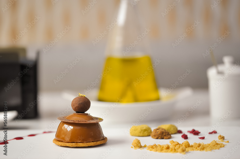 Close-up of a caramelized chocolate and mocha dessert on a platter served on a marble table at a fancy restaurant. Food and lifestyle background.