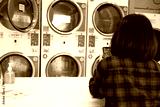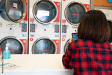 Rear view of woman sitting with mobile phone waiting for laundry washed in automatic washing machine at laundromat shop. Row of industrial washing machine in the coin laundry public laundromat.