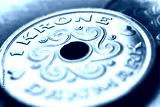 1 Danish krone coin close-up. National currency of Denmark. Blue tinted money illustration for news about economy or finance. Bank and loan. Savings and interest. Macro