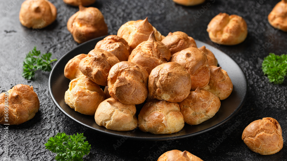 Savoury profiteroles stuffed with Molten cheddar cheese sauce, party food concept