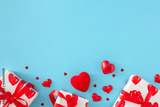 Valentine's Day gift concept. Flat lay composition made of gift boxes with silk ribbon and red hearts on pastel blue background with copy space. Lovers holiday card idea.
