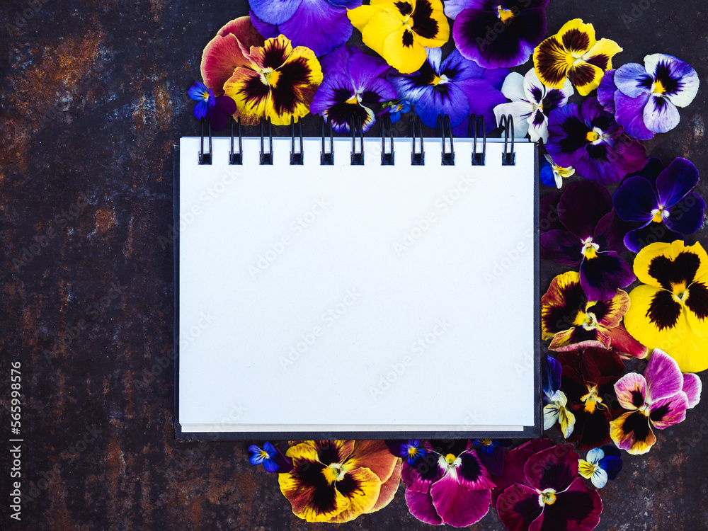 Bright flowers and a place for your congratulatory message. Close-up, view from above. No people. Concept of preparation for a holiday. Congratulations for relatives, friends and colleagues