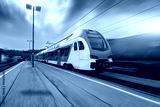 Blue high speed train in motion on the railway station at sunset. Fast modern intercity train and blurred background. Railway platform. Railroad in Slovenia. Commercial and passenger transportation