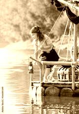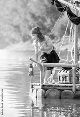 Children in pirate costumes play on a wooden raft at sunset. Two girls pretend to be the captains of a ship with black sails and a flag. Funny kids dreaming about adventure and travel.