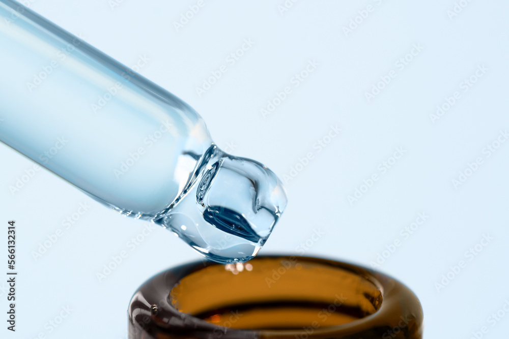 Cosmetic glass pipette with transparent serum, oil and brown bottle on a blue background. Beauty background, treatment and skin care.