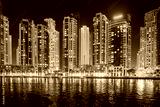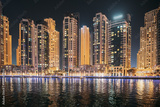 Night view of high-rise buildings of residential district in Dubai Marina. Dubai Marina Towers. Dubai Marina Skyline Background. Holidays In United Arab Emirates. Vacation In UAE. Night view of high