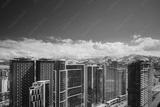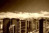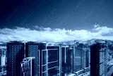 New Residential Multi-storey Houses On Blue Sky. Real Estate, Development Industry. highrise houses Elevated View Cityscape Skyline. Light Lighting. Industrial concept. Building industry.