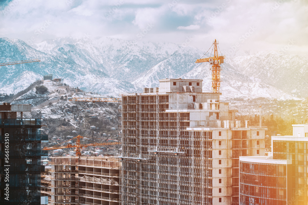 Construction Crane Is Involved In Development Of A New Multi-storey Residential Building. New Residential Multi-storey Houses On Blue Sky. Real Estate, Development Industry. highrise houses Elevated