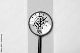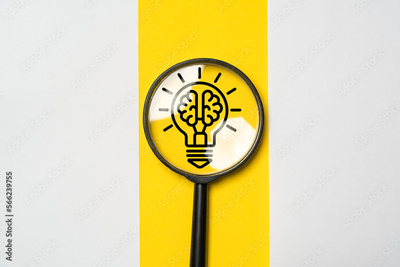 Drawing of glowing light bulb with brain inside of magnifier glass for creative thinking idea and problem solving concept.