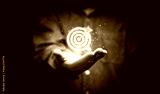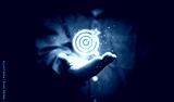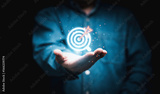 Businessman holding glowing virtual blue quality dartboard with red arrow for setup quality objective target and goal concept.