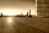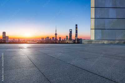 Empty square floor and city skyline with modern buildings at sunrise in Shanghai, China.