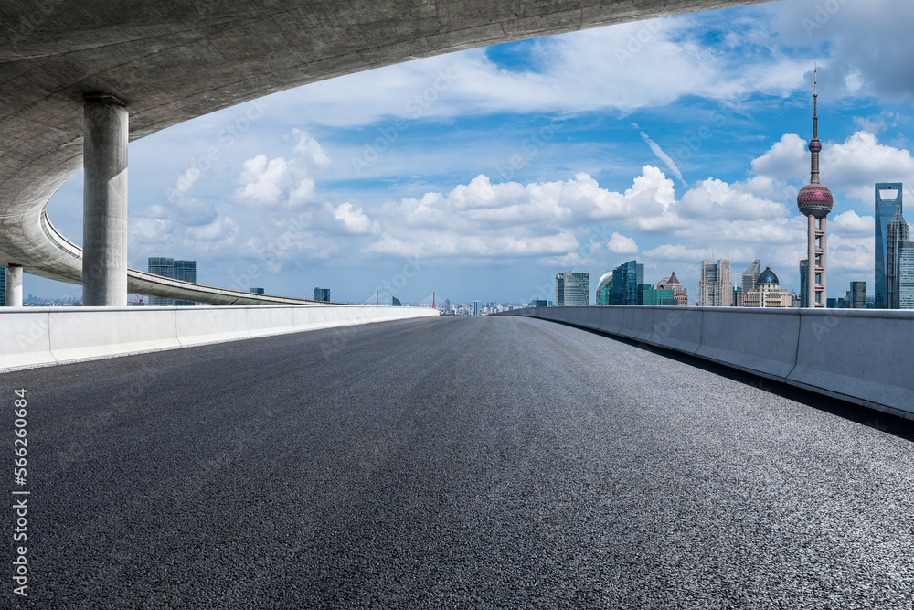 Asphalt road and city skyline with modern buildings in Shanghai, China.