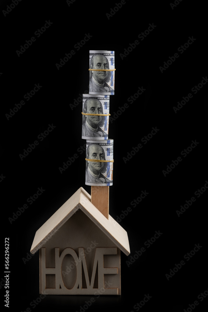 A symbolic wooden house with a long chimney made of 100 US dollar bills
