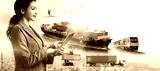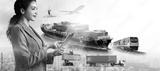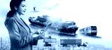 Business and technology digital future of cargo container logistics transportation import export concept, Business woman using tablet online tracking control delivery distribution world map background