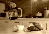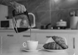 a man holds a teapot with coffee and pours into a white cup, a hot fresh drink, a plate of croissants stands nearby, all this against the backdrop of a beautiful white kitchen
