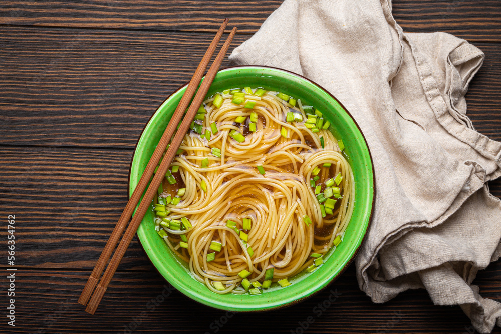 Asian noodles soup in green rustic ceramic bowl with wooden chopsticks top view on dark wooden background. Lo mein noodles with broth and green onion