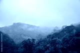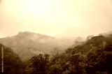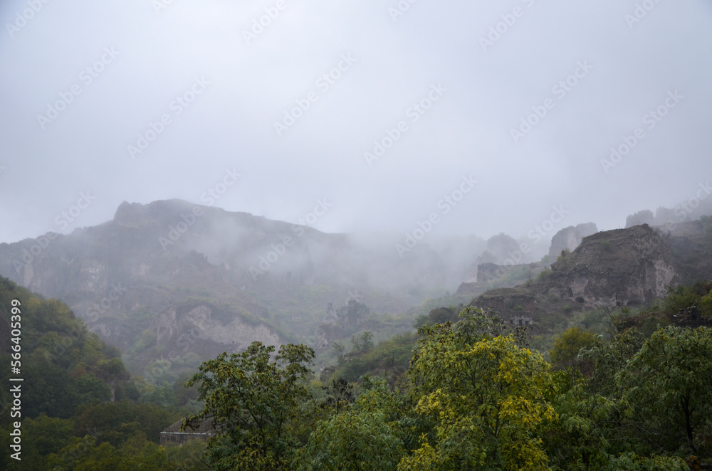 Steep slopes of a deep gorge covered fog of the Cave city Khndzoresk, one of the most impressive and mysterious places in Armenia