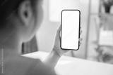 Hand holding digital smartphone mockup of blank screen. Take your screen to put on advertising.
