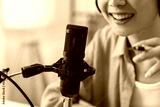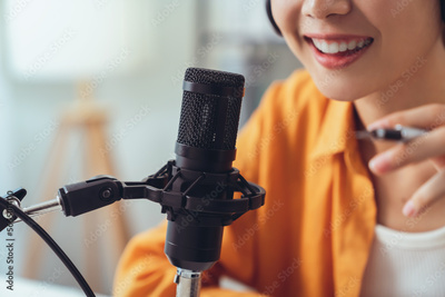 Woman use microphones wear headphones with laptop record podcast. Content creator concept.