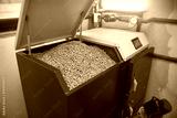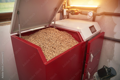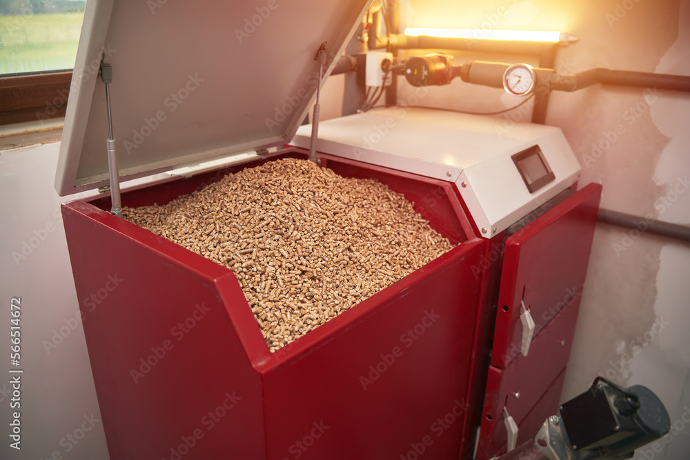 Wood pellets heating stove. Boiler room in private household working on alternative energy biofuel. Sustainable Future Concept