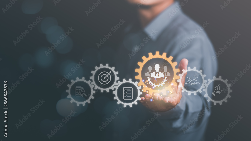 HRM or Human Resource Management ,Strategic planning for success through people business development concept by choosing professional leaders employee competency Teamwork, icons on human hands